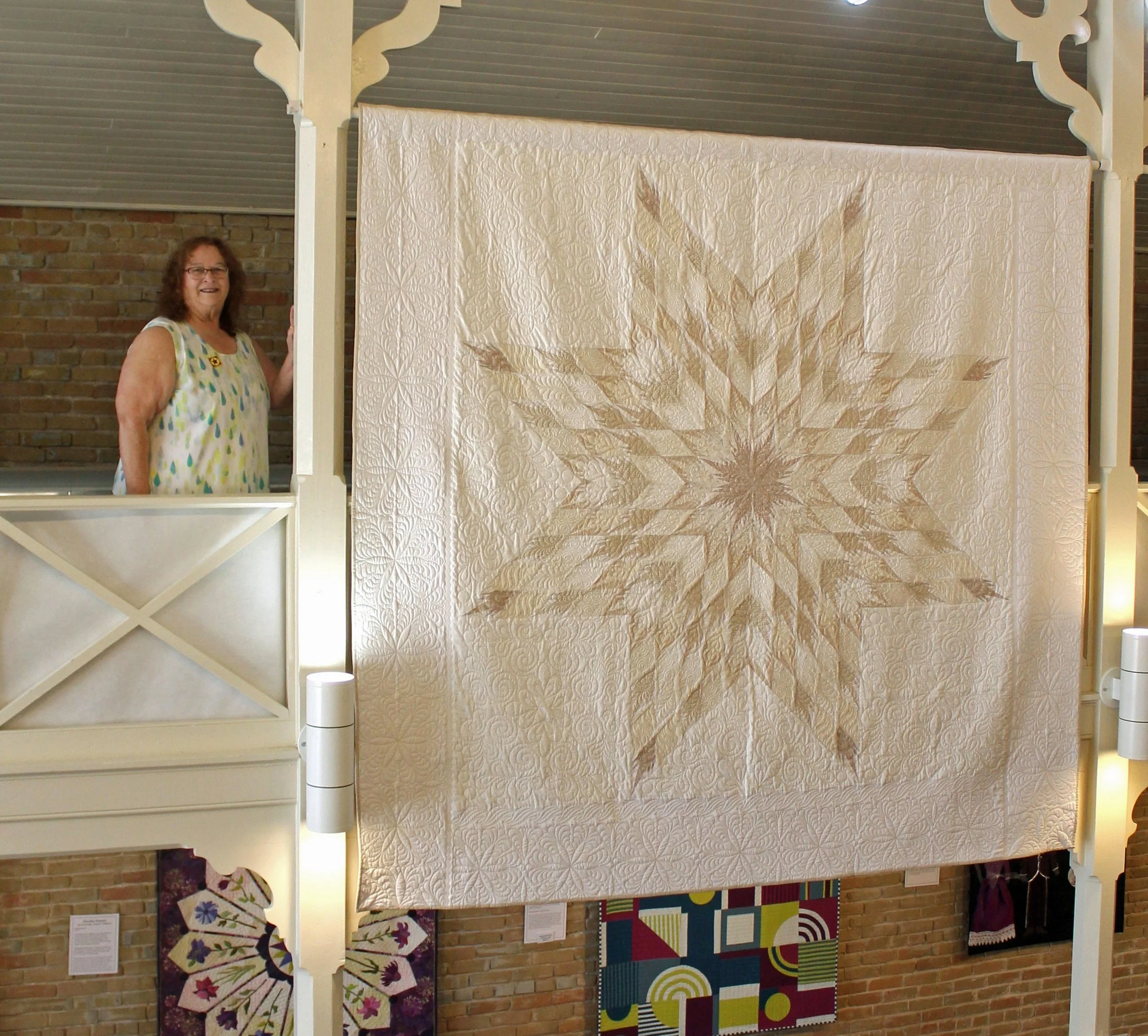 This is Sherry Melton with her “Star of Reflection” quilt from the exhibit “Houston Livestock Show & Rodeo Blue Ribbon Prizewinners 2025.” This was her first quilt!